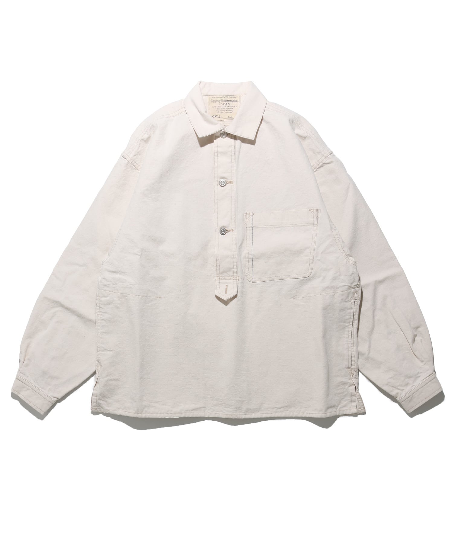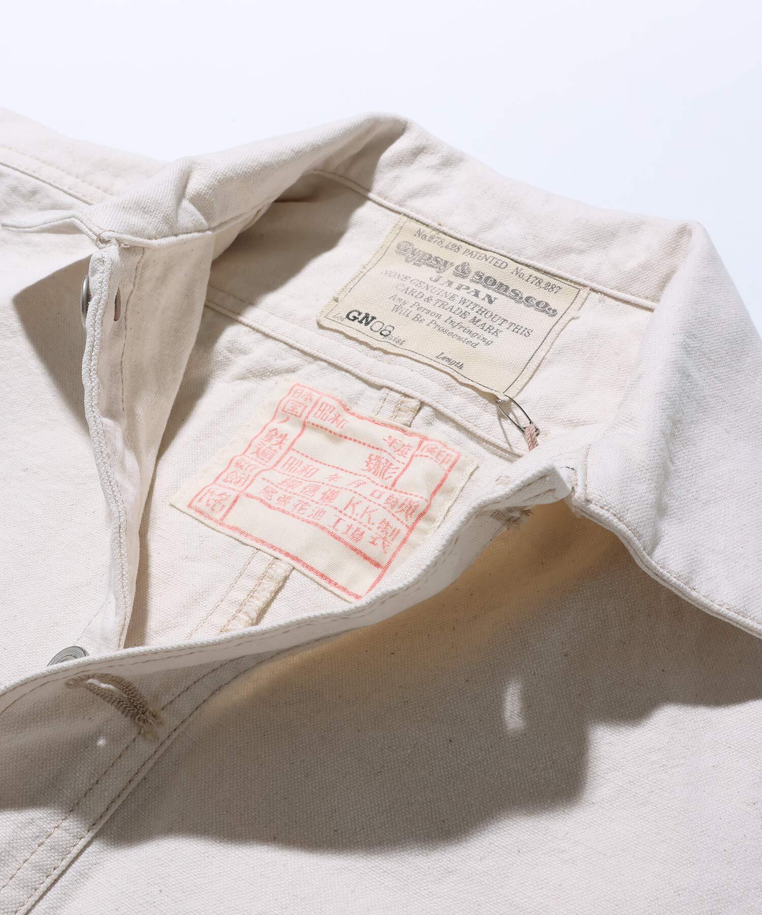 CROSED FRONT JAMPERと古い⽇本の鉄道員の作業着とを融合させた⼀着。