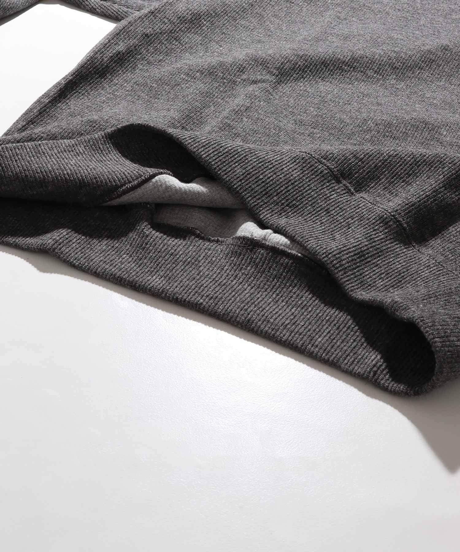 裏⾯には細番⼿の綿⽷を4倍のゲージ差を保ったまま接結した特殊素材です。