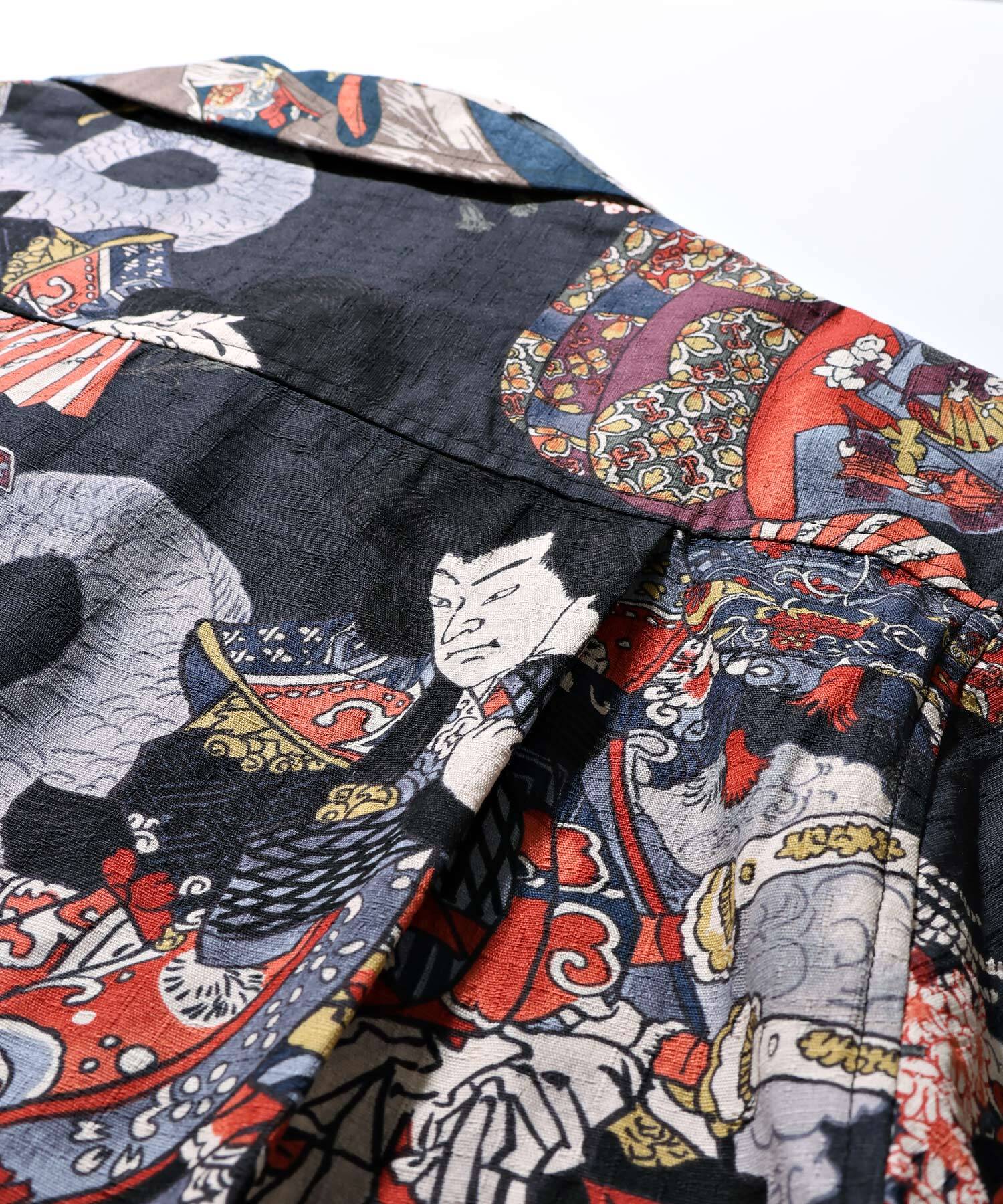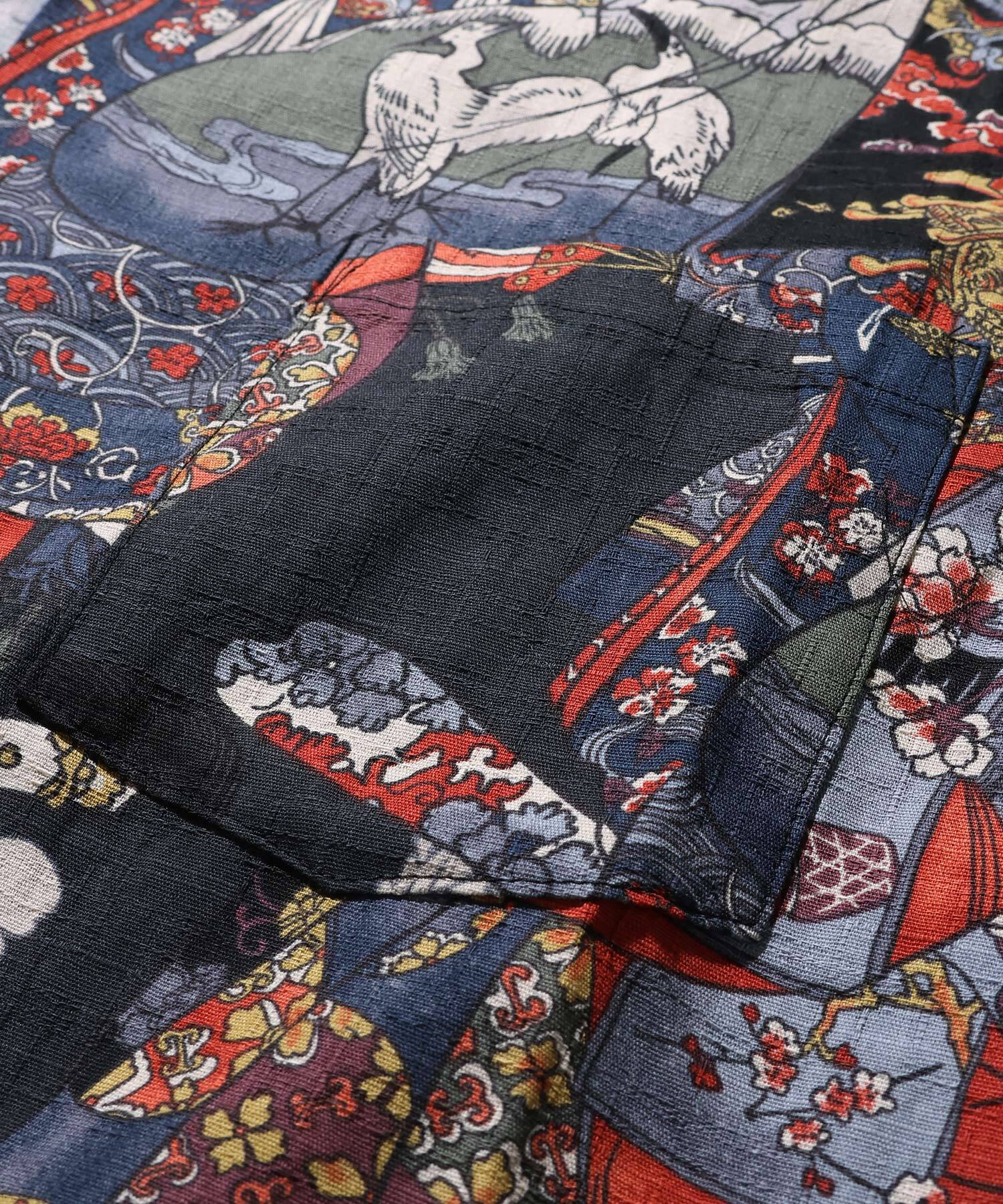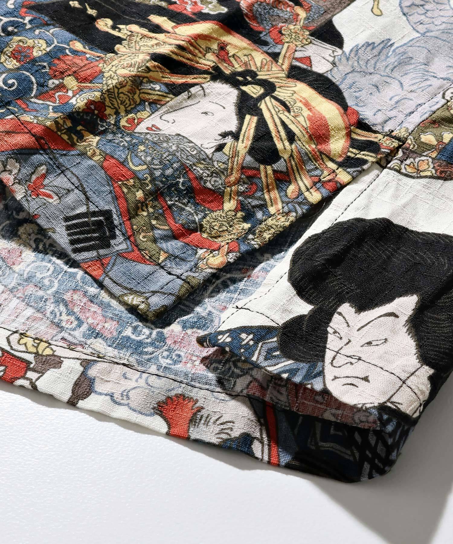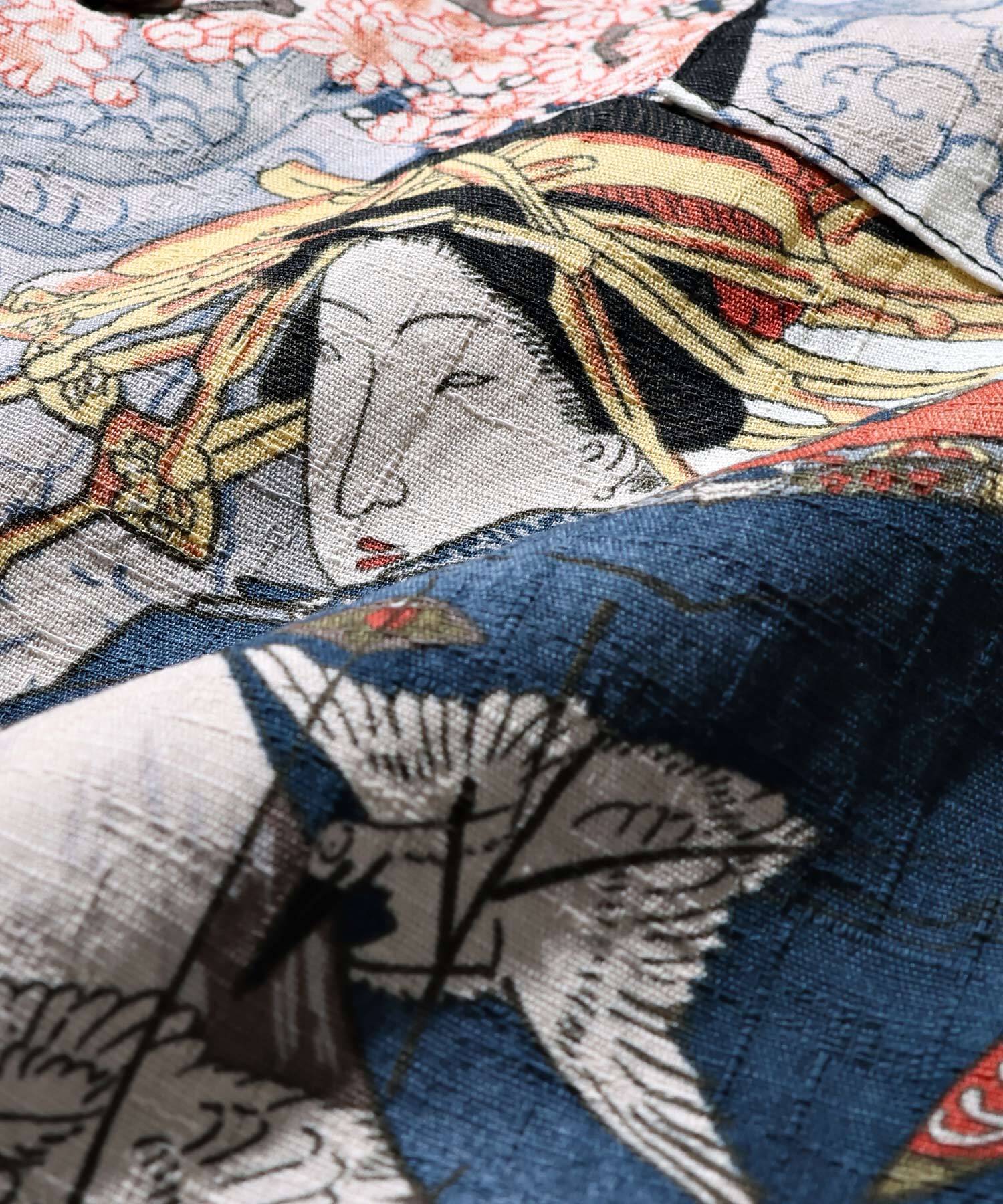 ドビー織機にて地柄に⼩格⼦柄を織り込んだ上に浮世絵柄を㮈染した和柄アロハシャツ。