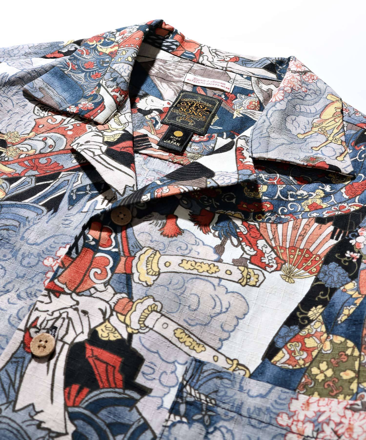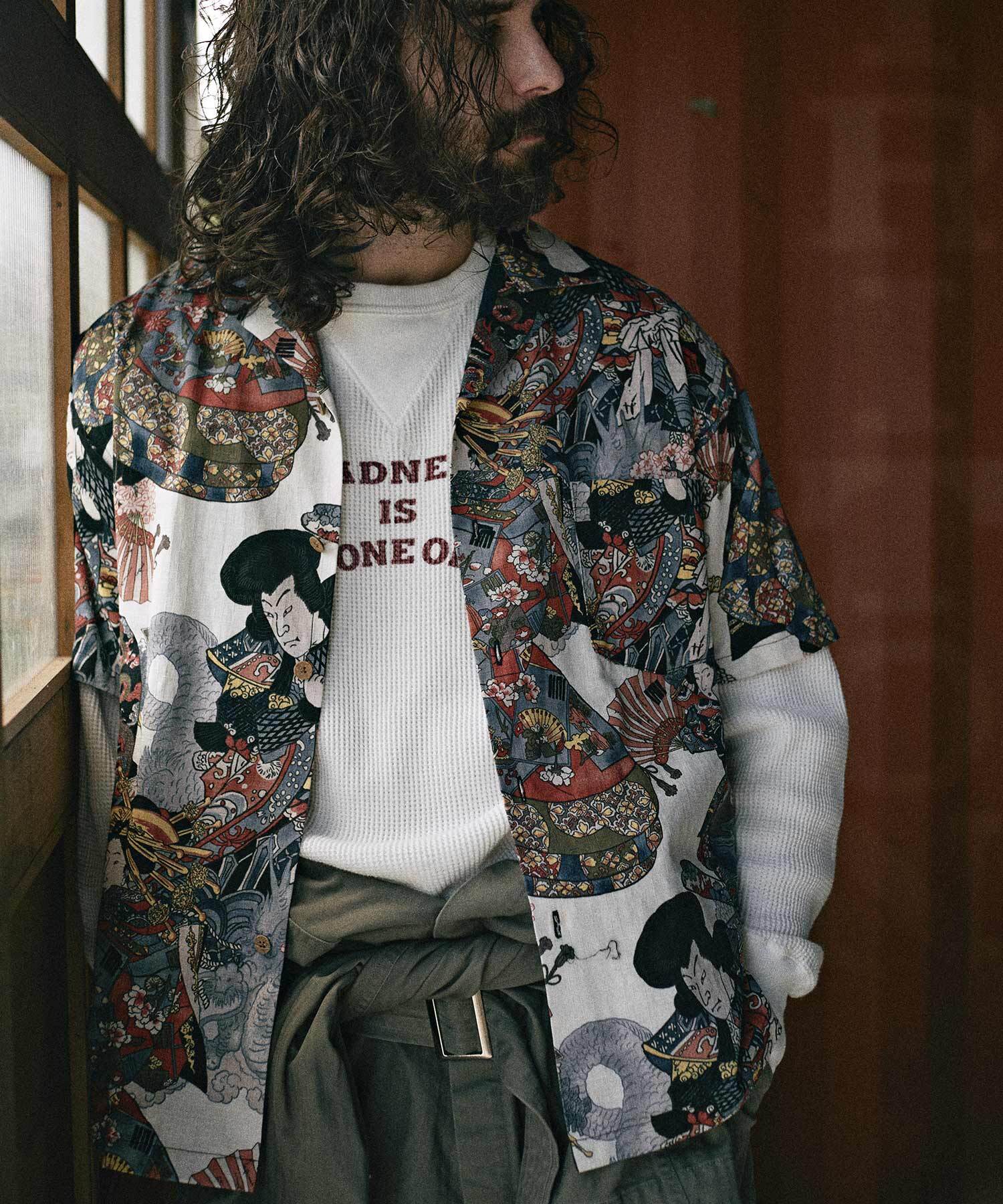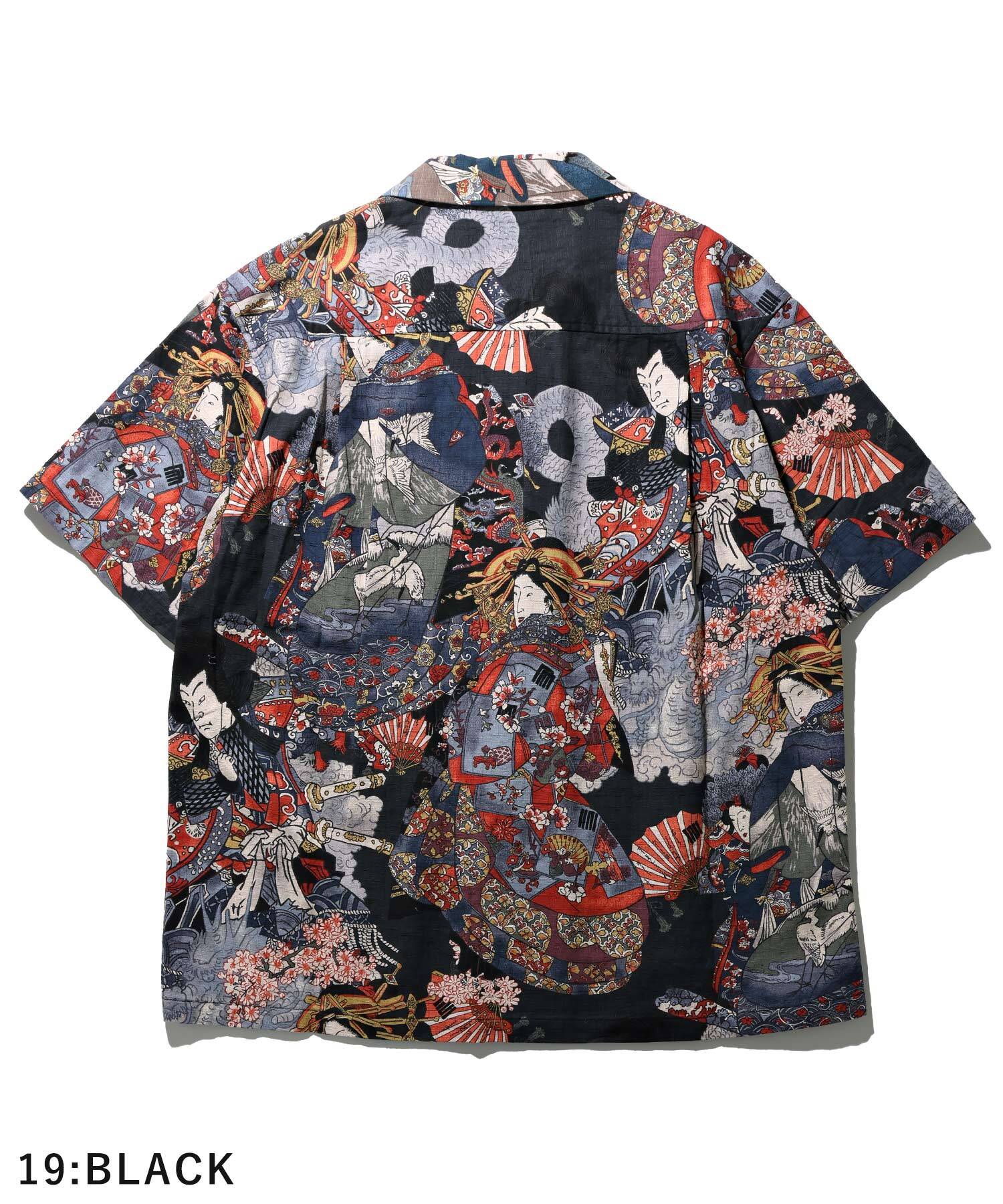 ドビー織機にて地柄に⼩格⼦柄を織り込んだ上に浮世絵柄を㮈染した和柄アロハシャツ。