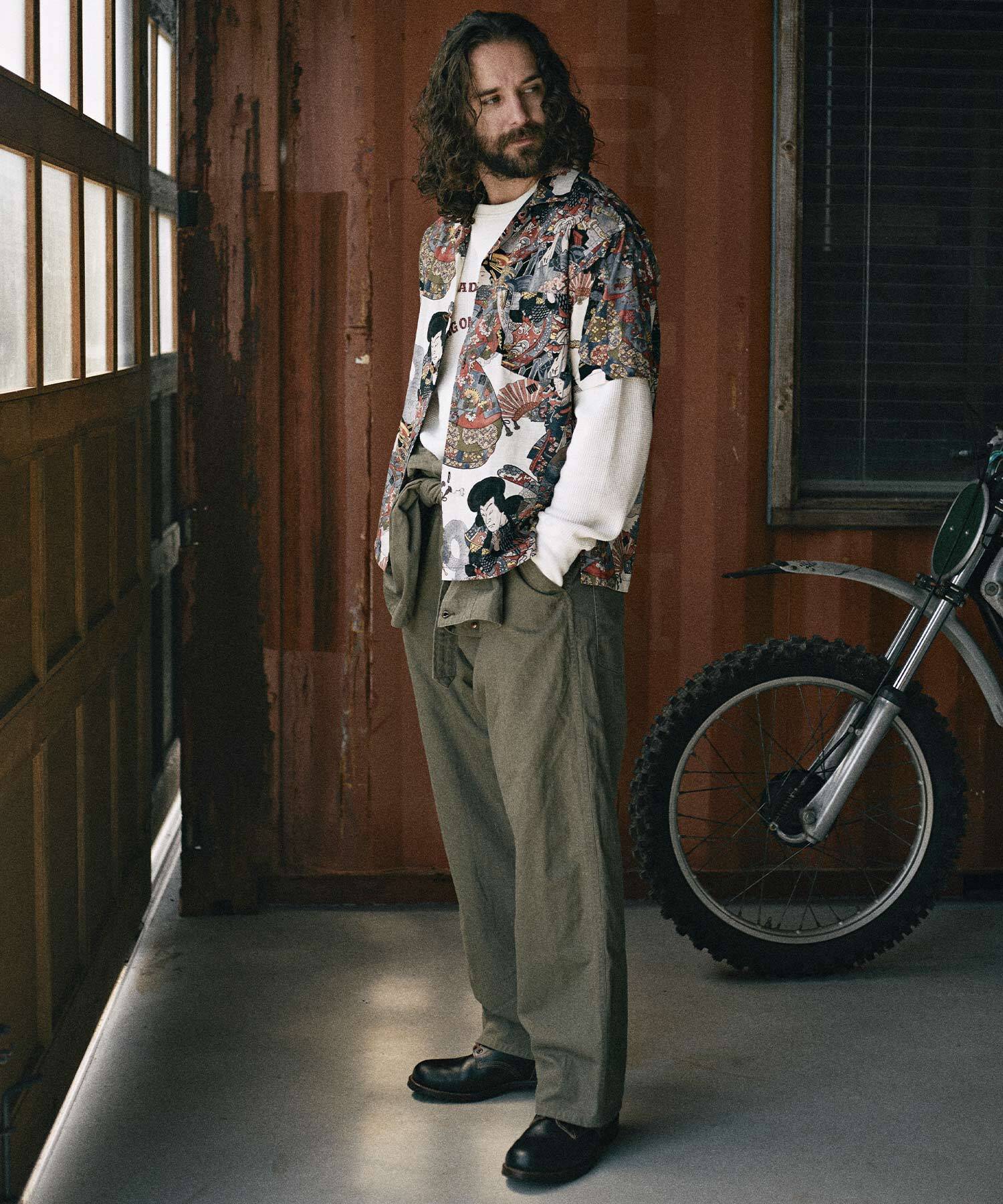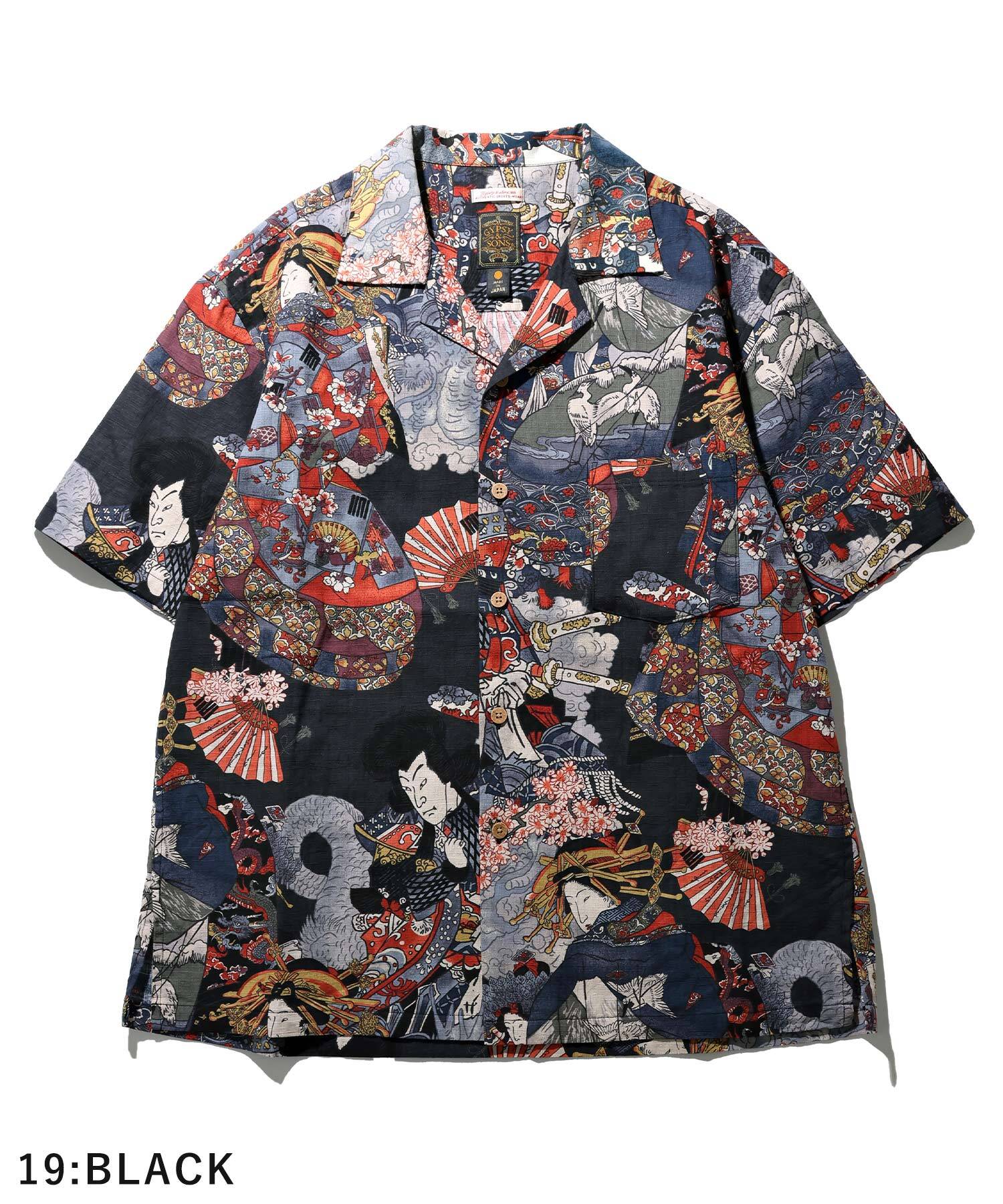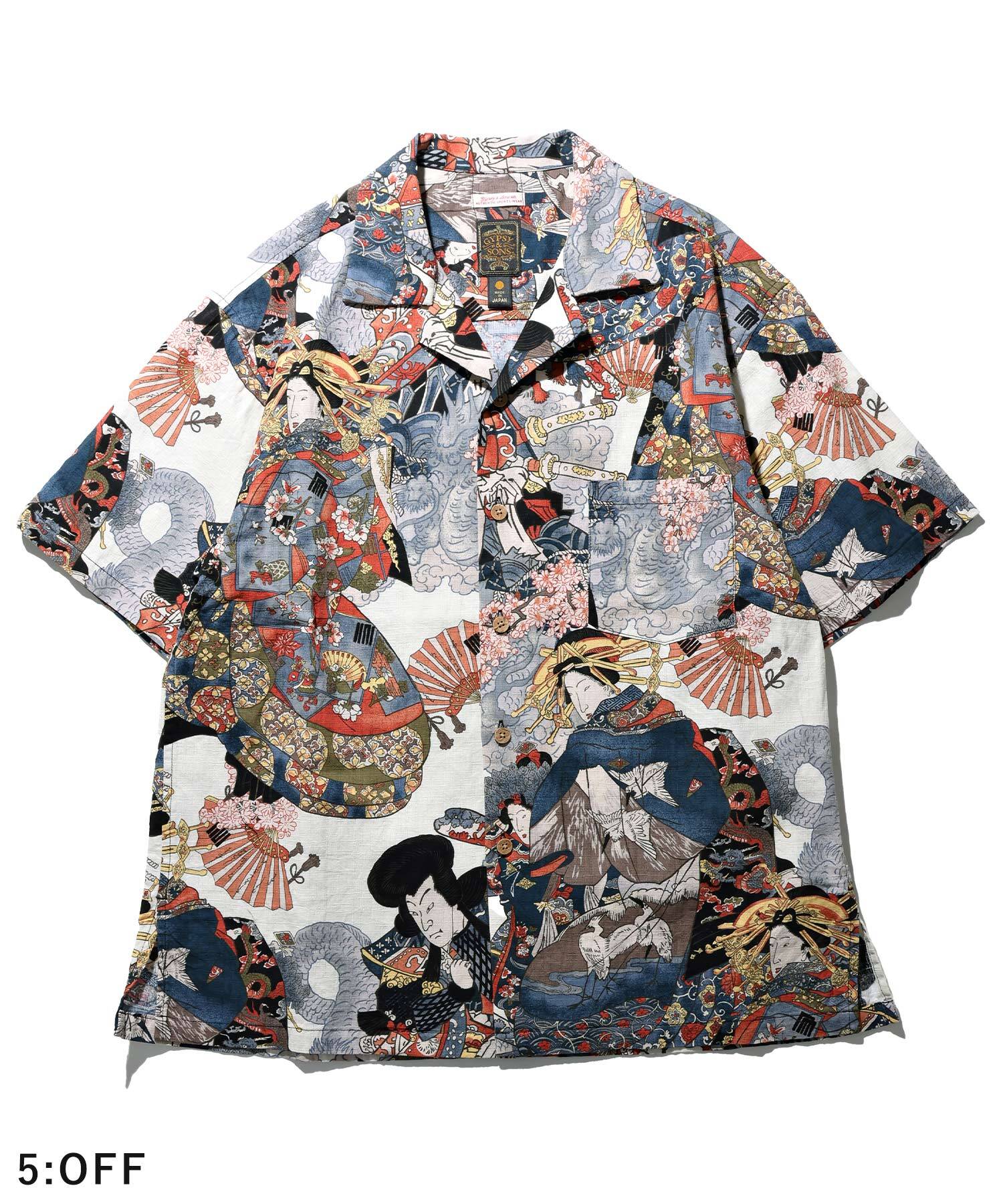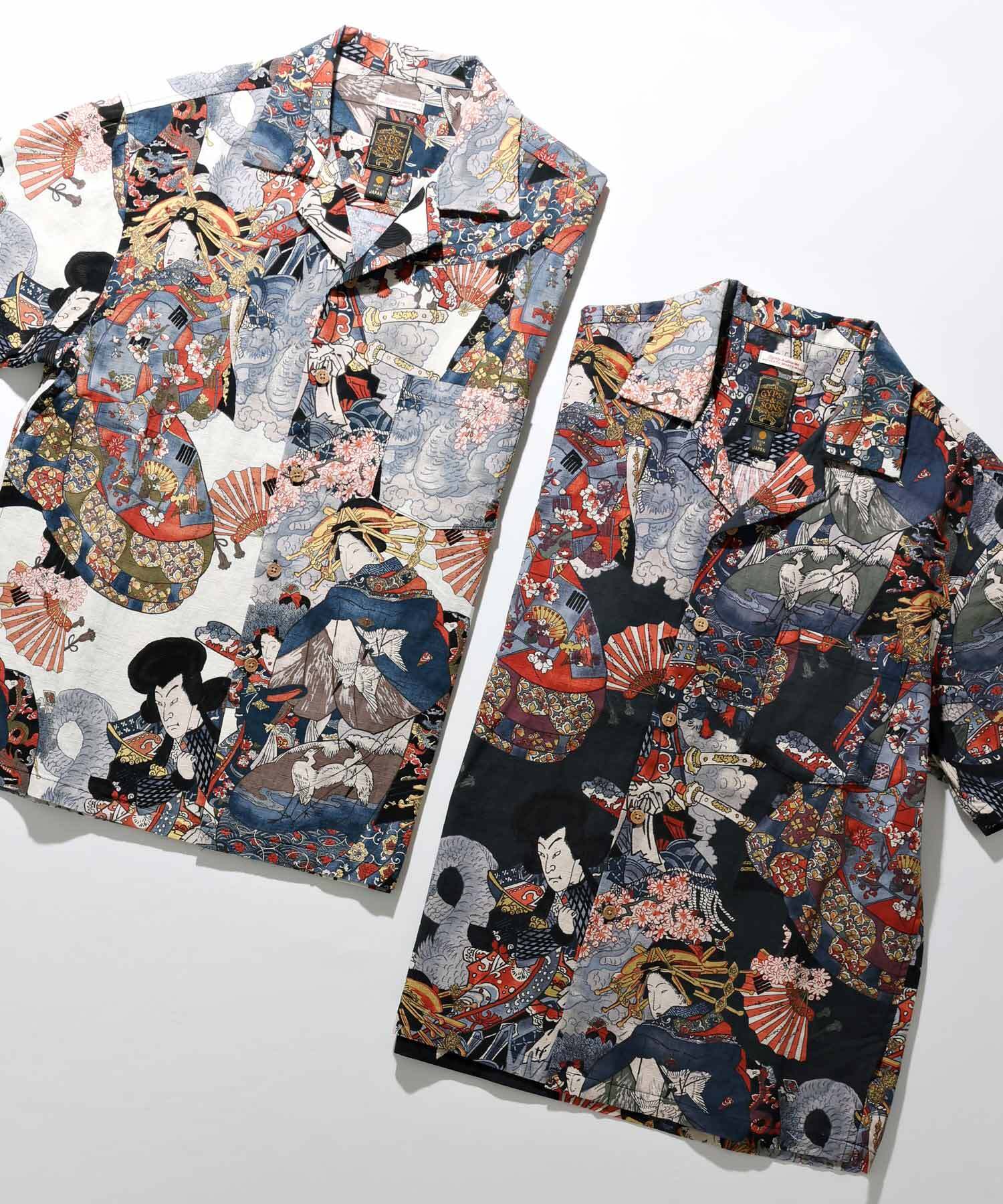 ドビー織機にて地柄に⼩格⼦柄を織り込んだ上に浮世絵柄を㮈染した和柄アロハシャツ。