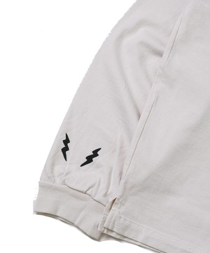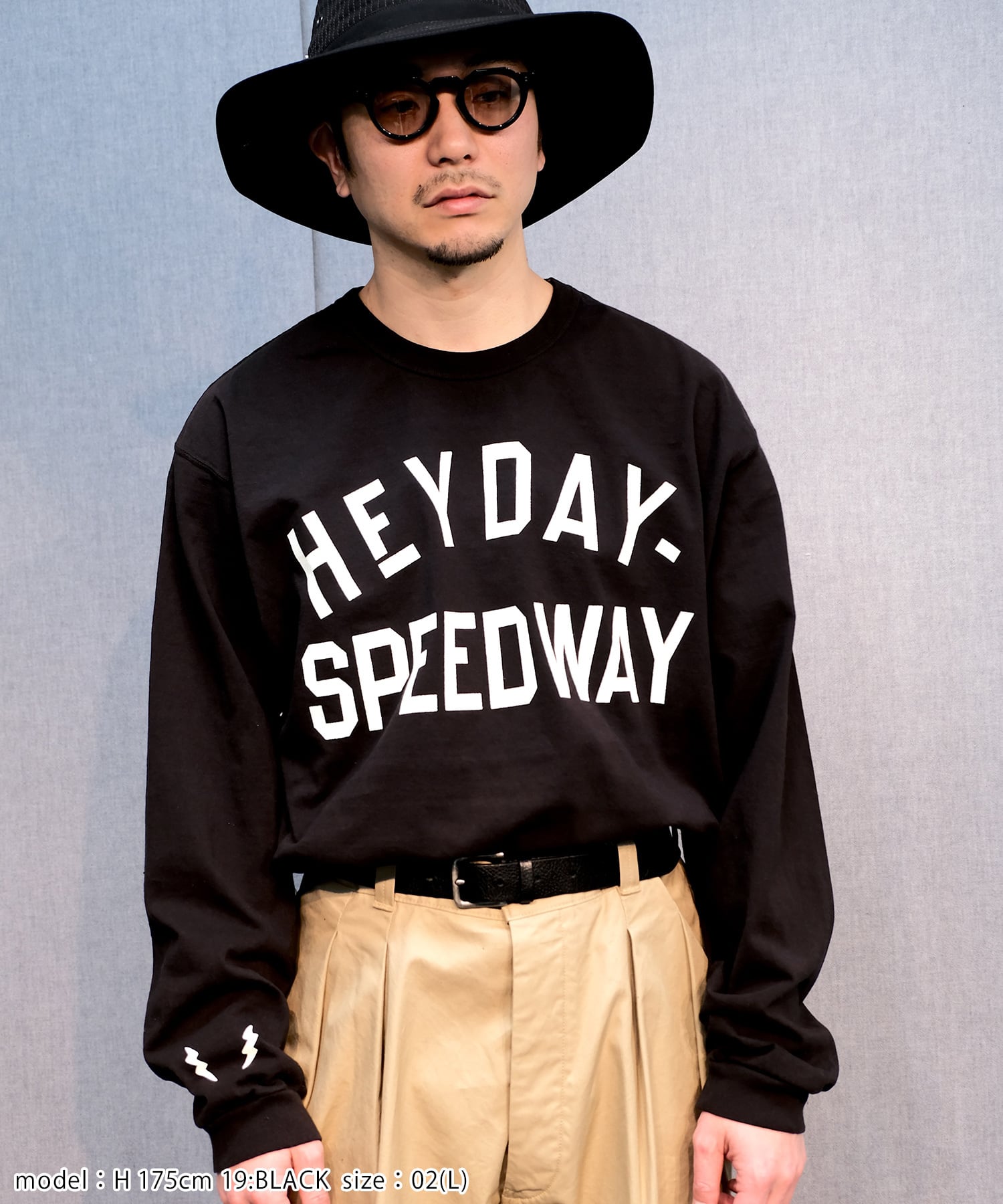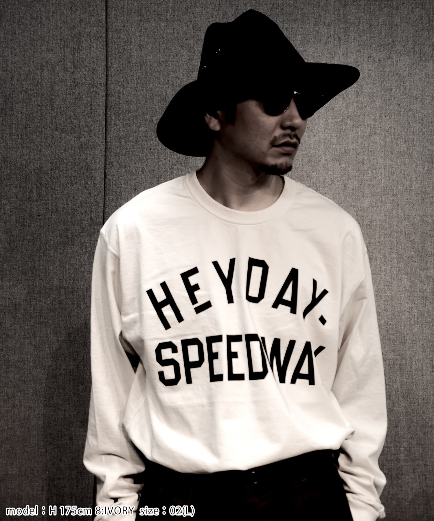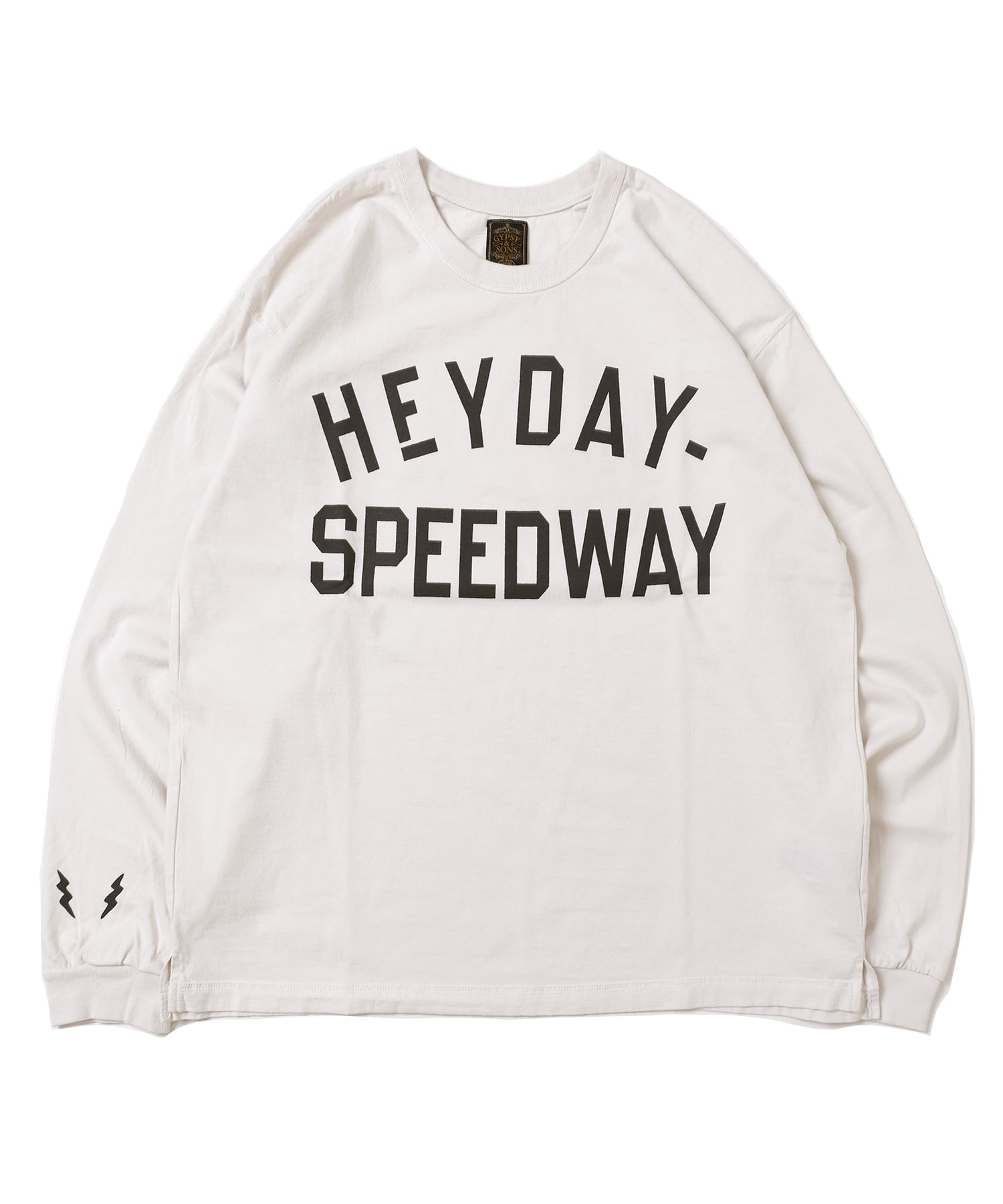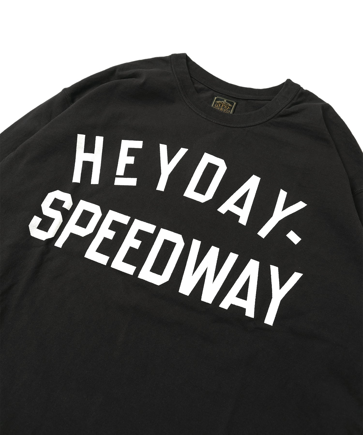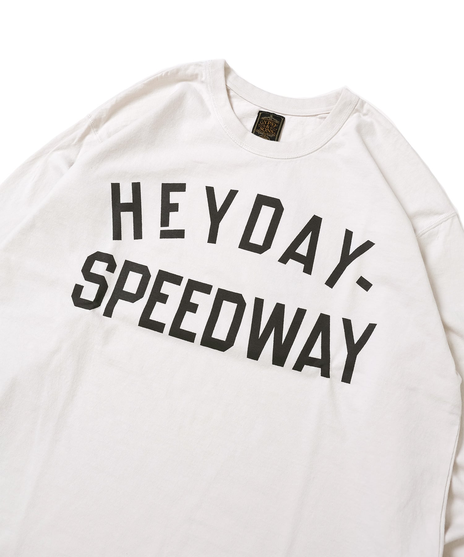 VMC架空のサーキット場『HEY DAY SPEEDWAY』のモーターサイクルスーベニアTEEをイメージ。1930sのモーターサイクルジャージより着想。重ね着をした際に前身の裾があまりにくい様に脇線を前に振って前身の裾を短く設定しております。スウェットなどの下から顔を覗かせる様に丈は気持ち長め。
